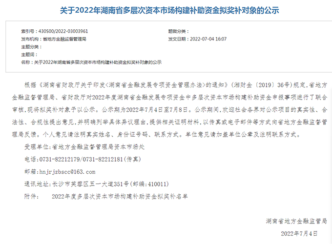 7月4日,湖南省地方金融監(jiān)督管理局正式公布了獲得2022年度湖南省金融發(fā)展專項資金中多層次資本市場構建補助資金的名單,萬寶投資集團全資子公司湖南鏈城私募股權基金管理有限公司順利通過湖南省地方金融監(jiān)督管理局和湖南省財政廳的聯(lián)合審核,獲得了省級主管單位的認可,名列其中,擬獲得補助資金75萬元,成為婁底市第一家榮獲湖南省金融專項發(fā)展資金補助的基金管理公司。