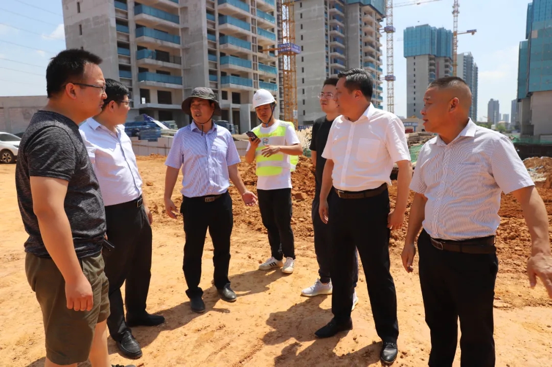 萬寶新區(qū)黨委副書記、管委會主任肖雄杰(右二),萬寶投資集團(tuán)總經(jīng)理徐業(yè)波(左二)在現(xiàn)場了解情況,處理施工中遇到的問題。