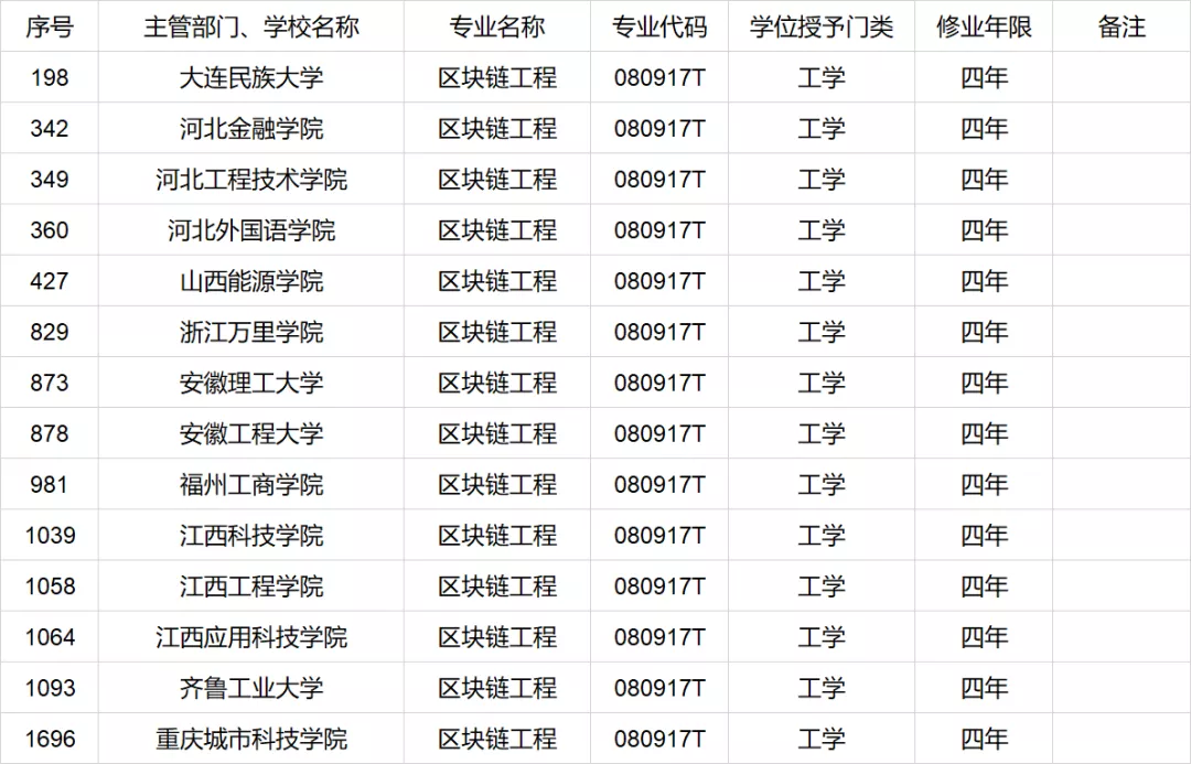 隨著區(qū)塊鏈在行業(yè)發(fā)展初期迎來短期爆發(fā)式的增長,必將面臨行業(yè)相關人才儲備不足,從業(yè)單位用人難的問題。為此,2021年2月10日,中華人民共和國教育部《關于公布2020年度普通高等學校本科專業(yè)備案和審批結(jié)果的通知》(簡稱《通知》)中公布,我國共有14家高等院校,申請開設了“區(qū)塊鏈工程”本科專業(yè)課程,持續(xù)為行業(yè)輸送后續(xù)力量,區(qū)塊鏈人才短缺問題,將在幾年后得到有效緩解,并持續(xù)為行業(yè)輸送后續(xù)力量。本次公布的14家高校分別為大連民族大學、河北金融學院、河北工程技術(shù)學院、河北外國語學院、山西能源學院、浙江萬里學院、安徽理工大學、安徽工程大學、福州工商學院、江西科技學院、江西工程學院、江西應用科技學院、齊魯工業(yè)大學、重慶城市科技學院。
