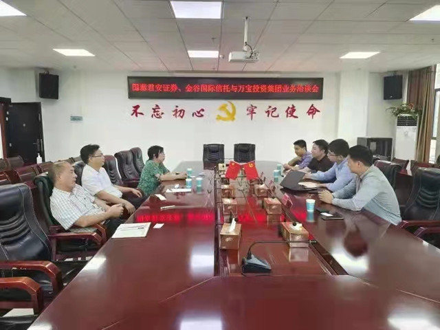 9月29日,國泰君安證券股份有限公司債務(wù)融資部業(yè)務(wù)董事陳洋、機(jī)構(gòu)客戶部執(zhí)行董事王晟,金谷國際信托公司廣東業(yè)務(wù)部執(zhí)行總經(jīng)理袁東陽一行,來萬寶投資集團(tuán)開展融資業(yè)務(wù)洽談。萬寶投資集團(tuán)董事長梁養(yǎng)賢率財(cái)務(wù)融資部負(fù)責(zé)人進(jìn)行接洽并組織召開座談會(huì)。